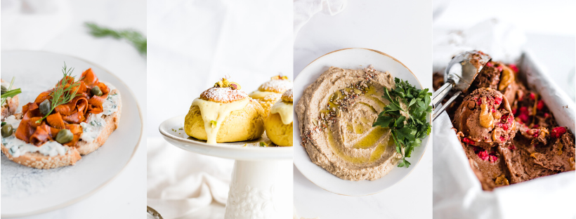 Carrot lox toast with herbed cheese - Saffron orange blossom cream buns - Roasted eggplant dip - Healthy Chocolate peanut butter ice cream